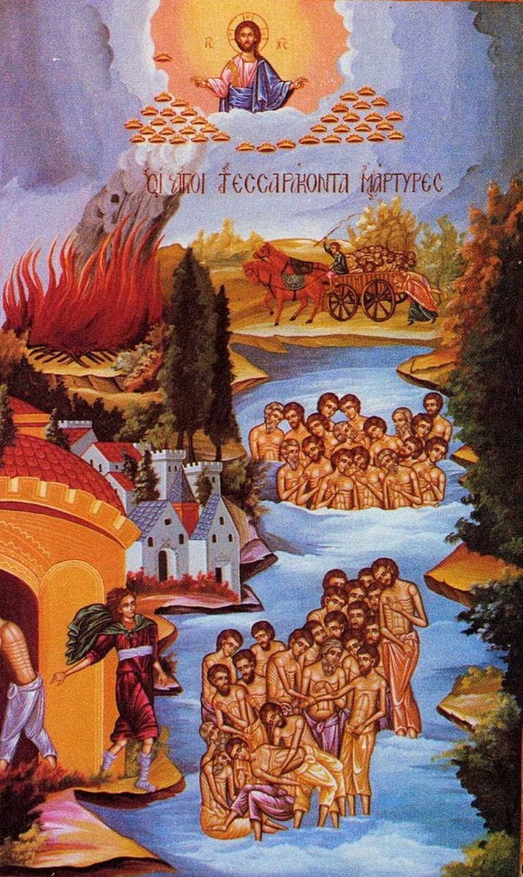 У IV ст. у вірменському місті Севастії один з військових начальників та ревний прихильник язичництва кинув до в’язниці 40 воїнів-християн за те, що вони відмовилися принести жертву язичницьким богам. Воїни ревно молилися і вночі почули голос: «Хто перетерпить до кінця, той спасеться». Маючи велику віру в Господа, вони закарбували в своїх серцях почуті слова й з Божою допомогою достойно витримували всі придумані для них катування. Була зима, і сильні морози скували води Севастійського озера, тож язичники придумати нові тортури — вони поставили воїнів-християн під вартою на кризі на цілу ніч. А щоб зламати волю мучеників, на березі розтопили баню. Коли вночі холод став нестерпним, один з воїнів не витримав і кинувся швидше до лазні, але тільки він переступив поріг, як впав мертвим. Свідком цього став один з вартових, який повірив у Господа і приєднався до мучеників. Таким чином їх знову стало 40.